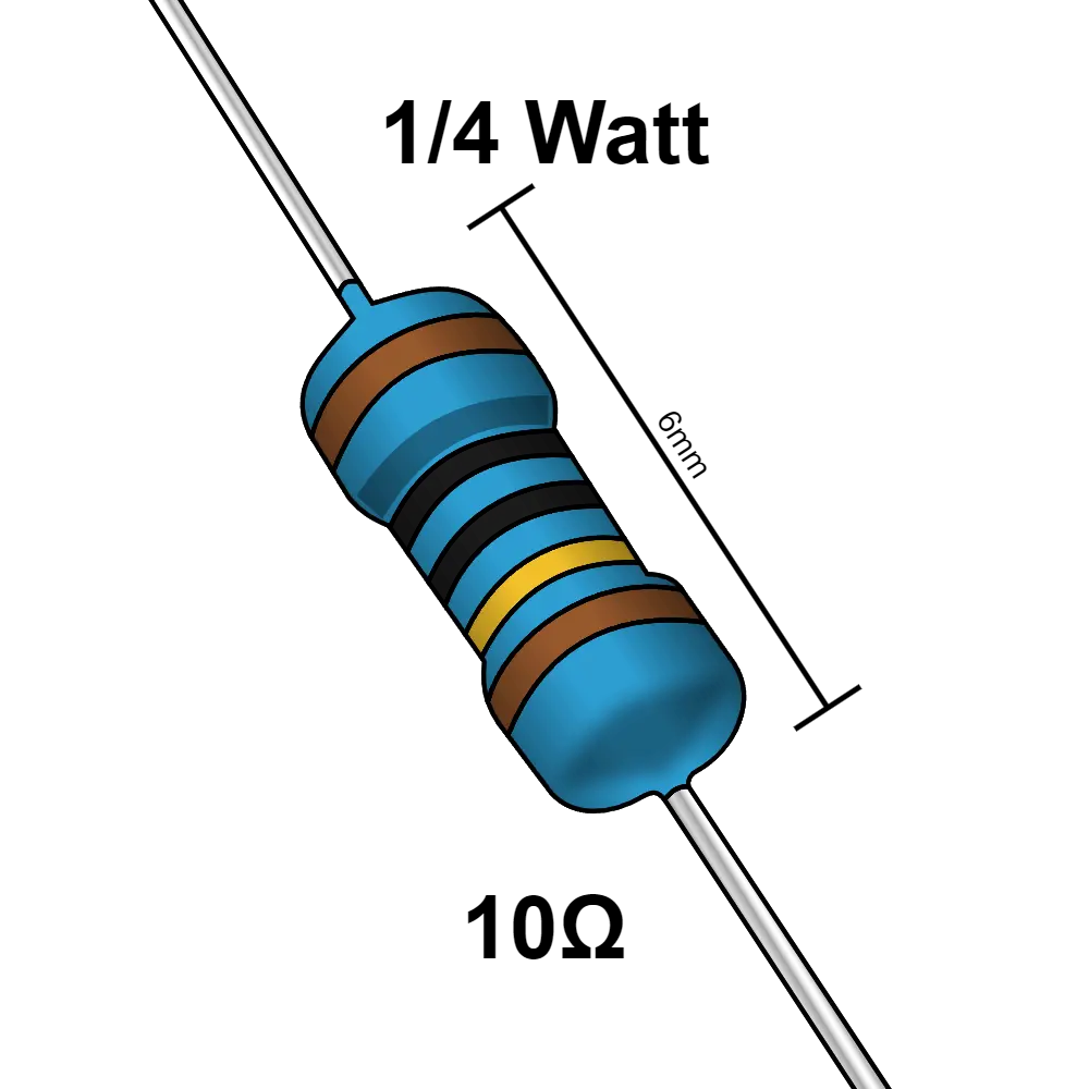 Las resistencias eléctricas son componentes semiconductores su principal función es limitar el paso de la corriente en un circuito eléctrico. Tiene diferentes usos, puede usarse desde un componente que ayude a generar un pequeño retardo en el funcionamiento de un circuito hasta generar diferentes frecuencias y poder aplicar un control en ciertos aparatos. Esta es una resistencia de 10 Ω y soporta una potencia máxima de ¼ W.