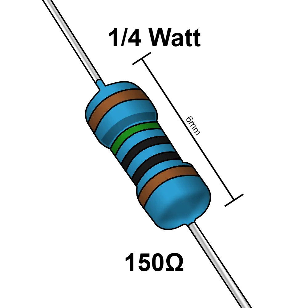 Las resistencias eléctricas son componentes semiconductores su principal función es limitar el paso de la corriente en un circuito eléctrico. Tiene diferentes usos, puede usarse desde un componente que ayude a generar un pequeño retardo en el funcionamiento de un circuito hasta generar diferentes frecuencias y poder aplicar un control en ciertos aparatos. Esta es una resistencia de 150 Ω y soporta una potencia máxima de ¼ W.