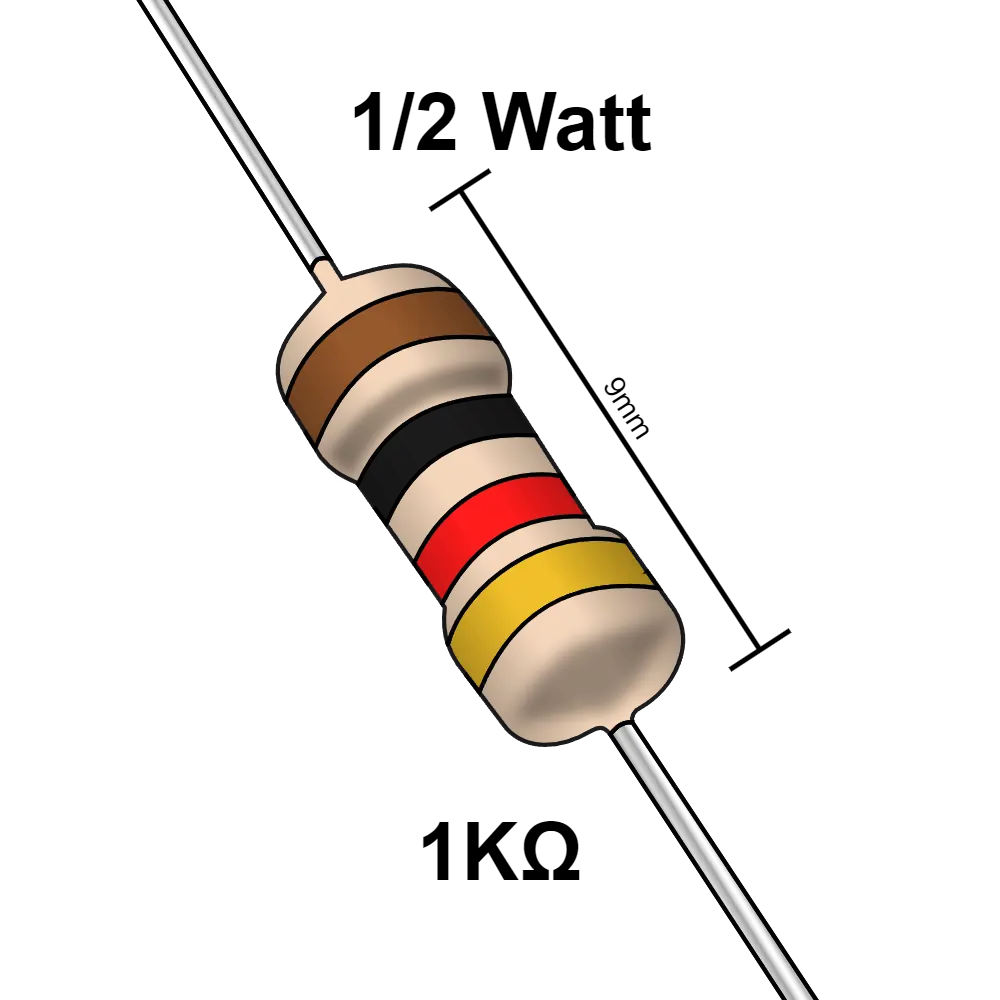 Las resistencias eléctricas son componentes semiconductores su principal función es limitar el paso de la corriente en un circuito eléctrico. Tiene diferente uso, puede usarse desde un componente que ayude a generar un pequeño retardo en el funcionamiento de un circuito hasta generar diferentes frecuencias y poder aplicar un control en ciertos aparatos. Esta es una resistencia de 1 KΩ y soporta una potencia maxima de ½ W.