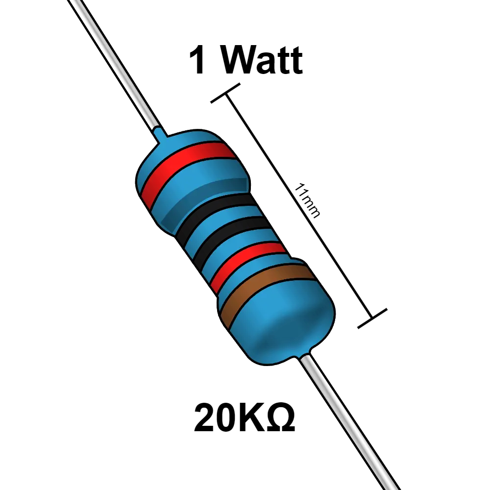 Las resistencias eléctricas son componentes semiconductores su principal función es limitar el paso de la corriente en un circuito eléctrico. tiene diferentes uso, puede usarse desde un componente que ayude a generar un pequeño retardo en el funcionamiento de un circuito hasta generar diferentes frecuencias y poder aplicar un control en ciertos aparatos. Esta es una resistencia de 20 KΩ y soporta una potencia maxima de 1 W.