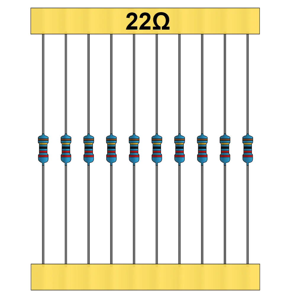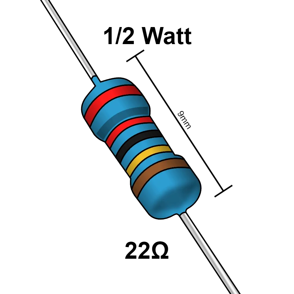 Las resistencias eléctricas son componentes semiconductores su principal función es limitar el paso de la corriente en un circuito eléctrico. tiene diferentes uso, puede usarse desde un componente que ayude a generar un pequeño retardo en el funcionamiento de un circuito hasta generar diferentes frecuencias y poder aplicar un control en ciertos aparatos. Esta es una resistencia de 22 Ω y soporta una potencia maxima de ½ W.