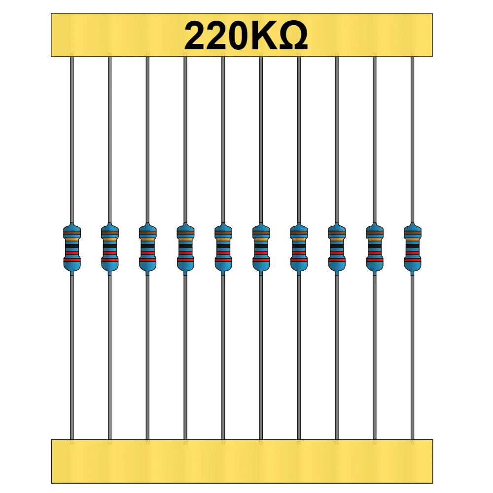 Las resistencias eléctricas son componentes semiconductores su principal función es limitar el paso de la corriente en un circuito eléctrico. tiene diferentes uso, puede usarse desde un componente que ayude a generar un pequeño retardo en el funcionamiento de un circuito hasta generar diferentes frecuencias y poder aplicar un control en ciertos aparatos. Esta es una resistencia de 220 KΩ y soporta una potencia maxima de 1 W.