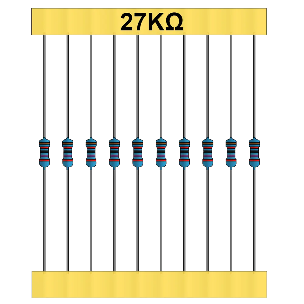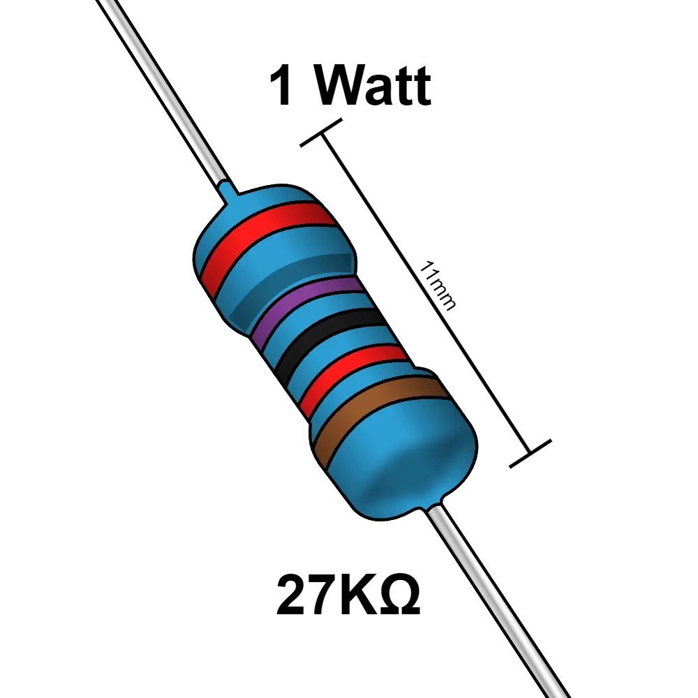 Las resistencias eléctricas son componentes semiconductores su principal función es limitar el paso de la corriente en un circuito eléctrico. tiene diferentes uso, puede usarse desde un componente que ayude a generar un pequeño retardo en el funcionamiento de un circuito hasta generar diferentes frecuencias y poder aplicar un control en ciertos aparatos. Esta es una resistencia de 27 KΩ y soporta una potencia maxima de 1 W.