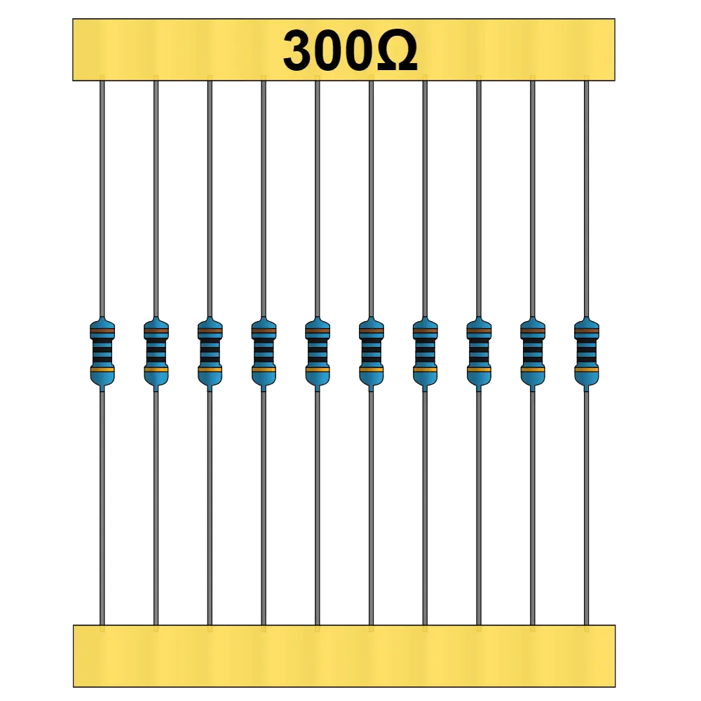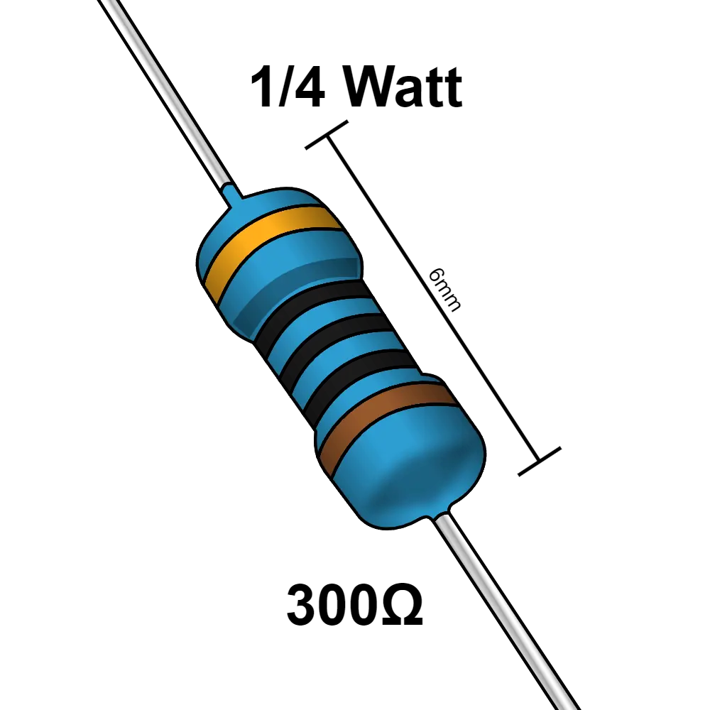 Las resistencias eléctricas son componentes semiconductores su principal función es limitar el paso de la corriente en un circuito eléctrico. Tiene diferentes usos, puede usarse desde un componente que ayude a generar un pequeño retardo en el funcionamiento de un circuito hasta generar diferentes frecuencias y poder aplicar un control en ciertos aparatos. Esta es una resistencia de 300 Ω y soporta una potencia máxima de ¼ W.