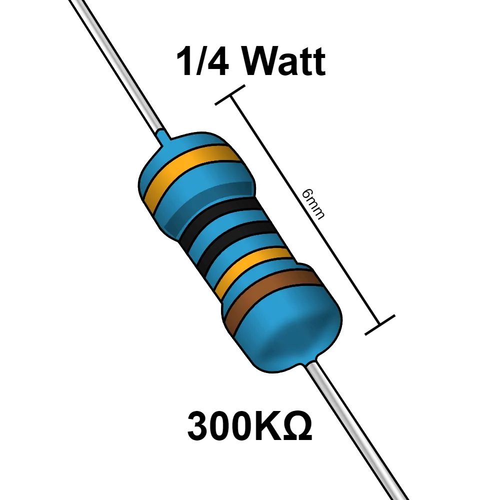 Las resistencias eléctricas son componentes semiconductores su principal función es limitar el paso de la corriente en un circuito eléctrico. Tiene diferentes usos, puede usarse desde un componente que ayude a generar un pequeño retardo en el funcionamiento de un circuito hasta generar diferentes frecuencias y poder aplicar un control en ciertos aparatos. Esta es una resistencia de 300 KΩ y soporta una potencia máxima de ¼ W.
