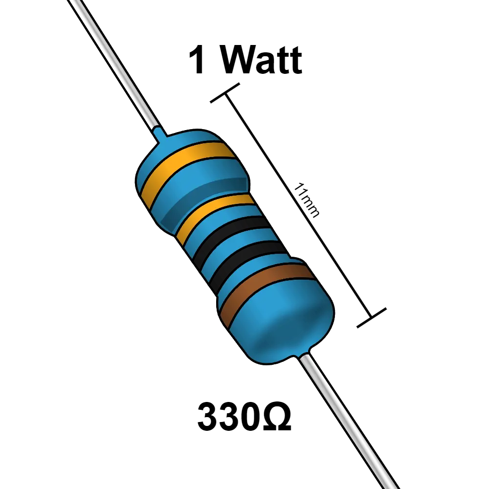 Las resistencias eléctricas son componentes semiconductores su principal función es limitar el paso de la corriente en un circuito eléctrico. tiene diferentes uso, puede usarse desde un componente que ayude a generar un pequeño retardo en el funcionamiento de un circuito hasta generar diferentes frecuencias y poder aplicar un control en ciertos aparatos. Esta es una resistencia de 330 Ω y soporta una potencia maxima de 1 W.