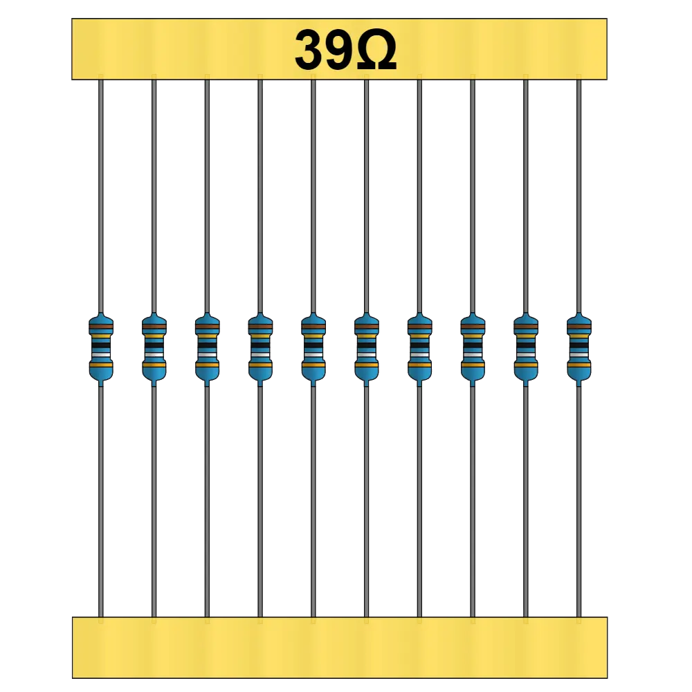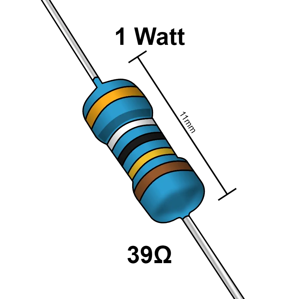 Las resistencias eléctricas son componentes semiconductores su principal función es limitar el paso de la corriente en un circuito eléctrico. tiene diferentes uso, puede usarse desde un componente que ayude a generar un pequeño retardo en el funcionamiento de un circuito hasta generar diferentes frecuencias y poder aplicar un control en ciertos aparatos. Esta es una resistencia de 39 Ω y soporta una potencia maxima de 1 W.