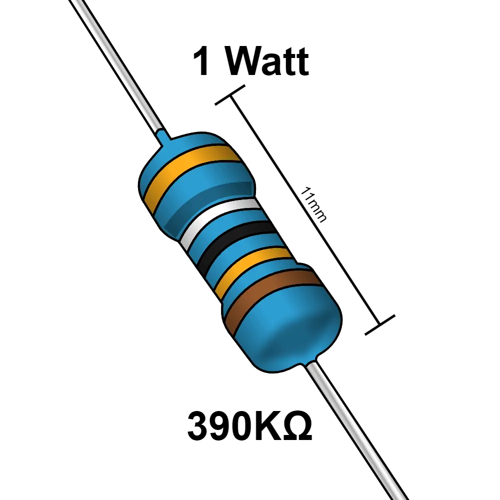 Las resistencias eléctricas son componentes semiconductores su principal función es limitar el paso de la corriente en un circuito eléctrico. tiene diferentes uso, puede usarse desde un componente que ayude a generar un pequeño retardo en el funcionamiento de un circuito hasta generar diferentes frecuencias y poder aplicar un control en ciertos aparatos. Esta es una resistencia de 390 KΩ y soporta una potencia maxima de 1 W.