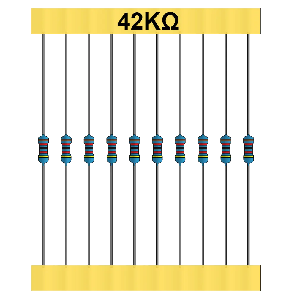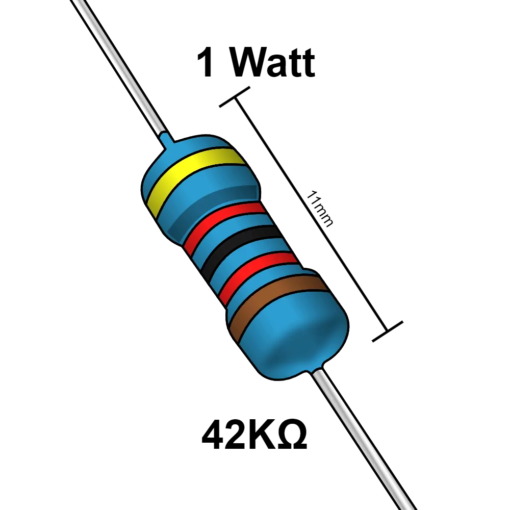 Las resistencias eléctricas son componentes semiconductores su principal función es limitar el paso de la corriente en un circuito eléctrico. tiene diferentes uso, puede usarse desde un componente que ayude a generar un pequeño retardo en el funcionamiento de un circuito hasta generar diferentes frecuencias y poder aplicar un control en ciertos aparatos. Esta es una resistencia de 42 KΩ y soporta una potencia maxima de 1 W.