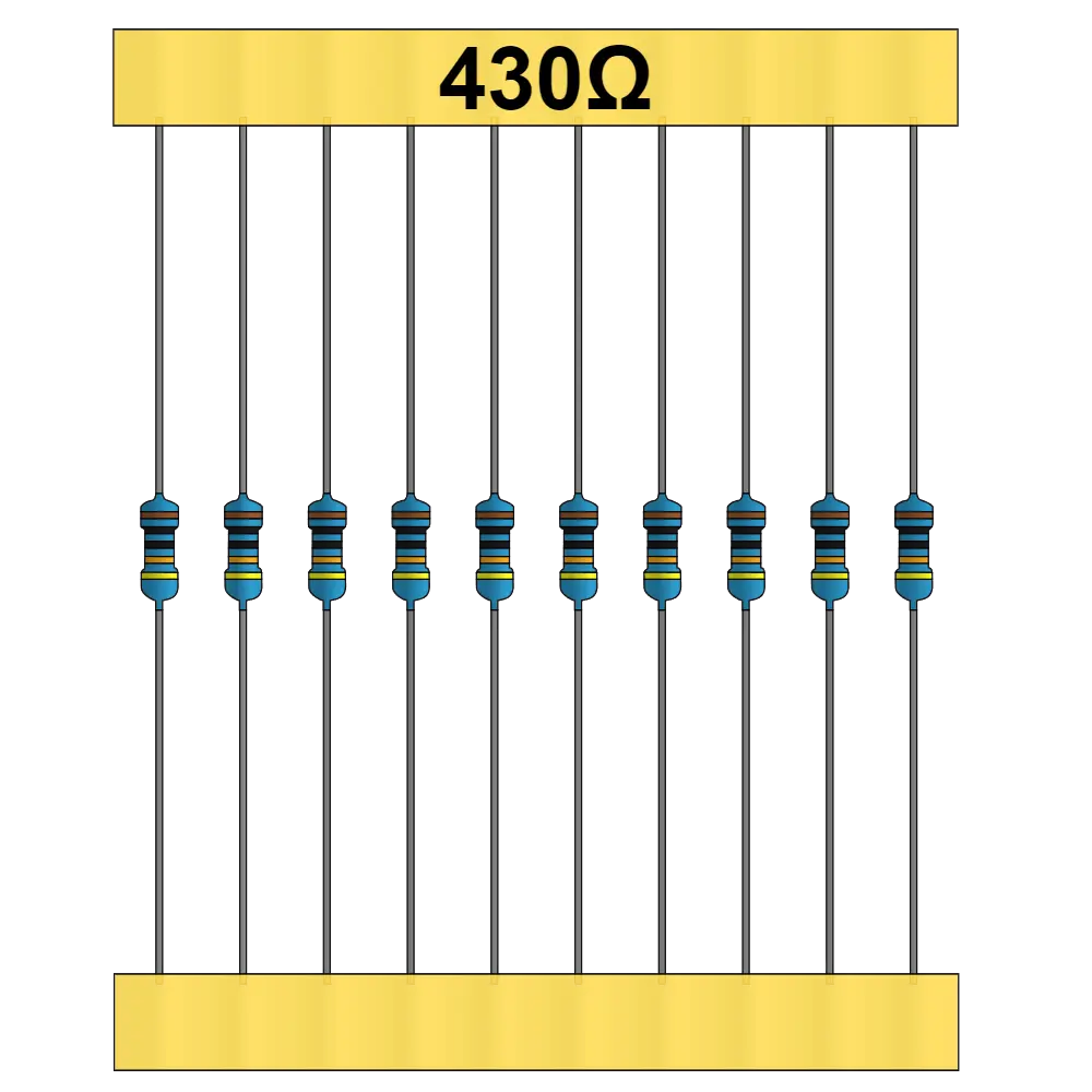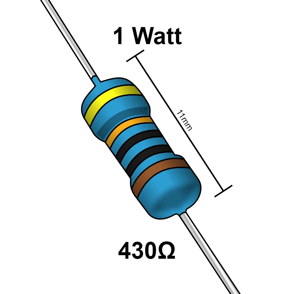 Las resistencias eléctricas son componentes semiconductores su principal función es limitar el paso de la corriente en un circuito eléctrico. tiene diferentes uso, puede usarse desde un componente que ayude a generar un pequeño retardo en el funcionamiento de un circuito hasta generar diferentes frecuencias y poder aplicar un control en ciertos aparatos. Esta es una resistencia de 430 Ω y soporta una potencia maxima de 1 W.