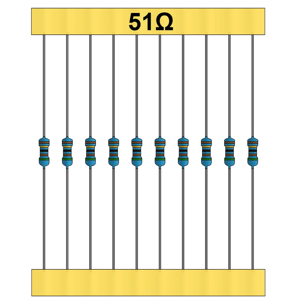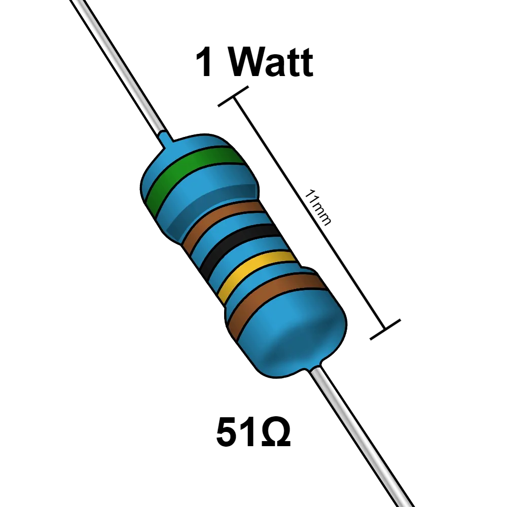 Las resistencias eléctricas son componentes semiconductores su principal función es limitar el paso de la corriente en un circuito eléctrico. tiene diferentes uso, puede usarse desde un componente que ayude a generar un pequeño retardo en el funcionamiento de un circuito hasta generar diferentes frecuencias y poder aplicar un control en ciertos aparatos. Esta es una resistencia de 51 Ω y soporta una potencia maxima de 1 W.