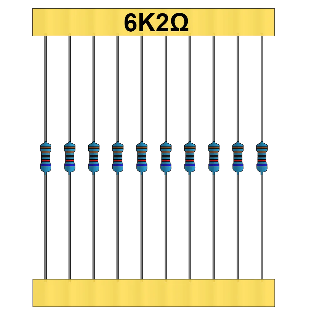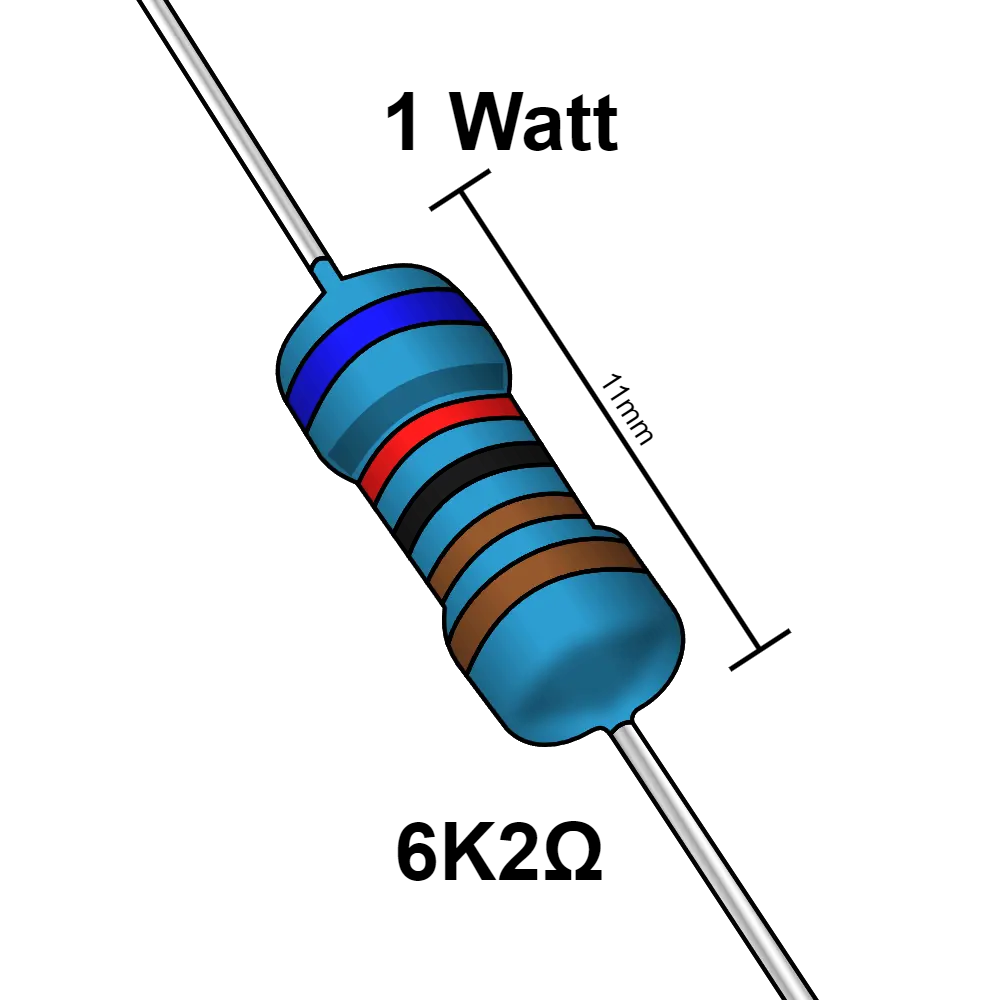 Las resistencias eléctricas son componentes semiconductores su principal función es limitar el paso de la corriente en un circuito eléctrico. tiene diferentes uso, puede usarse desde un componente que ayude a generar un pequeño retardo en el funcionamiento de un circuito hasta generar diferentes frecuencias y poder aplicar un control en ciertos aparatos. Esta es una resistencia de 6k2 Ω y soporta una potencia maxima de 1 W.