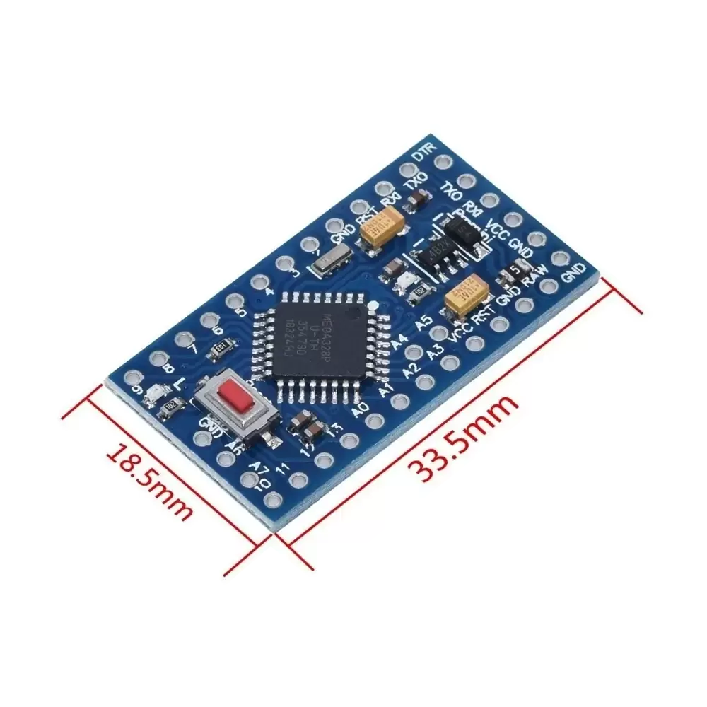 El Pro Mini compatible con Arduino es una tarjeta de desarrollo basada en el ATmega328 con 32 KB de memoria flash, útil en proyectos donde el tamaño sea un factor limitante, por lo demás es tan versátil cómo un Arduino UNO