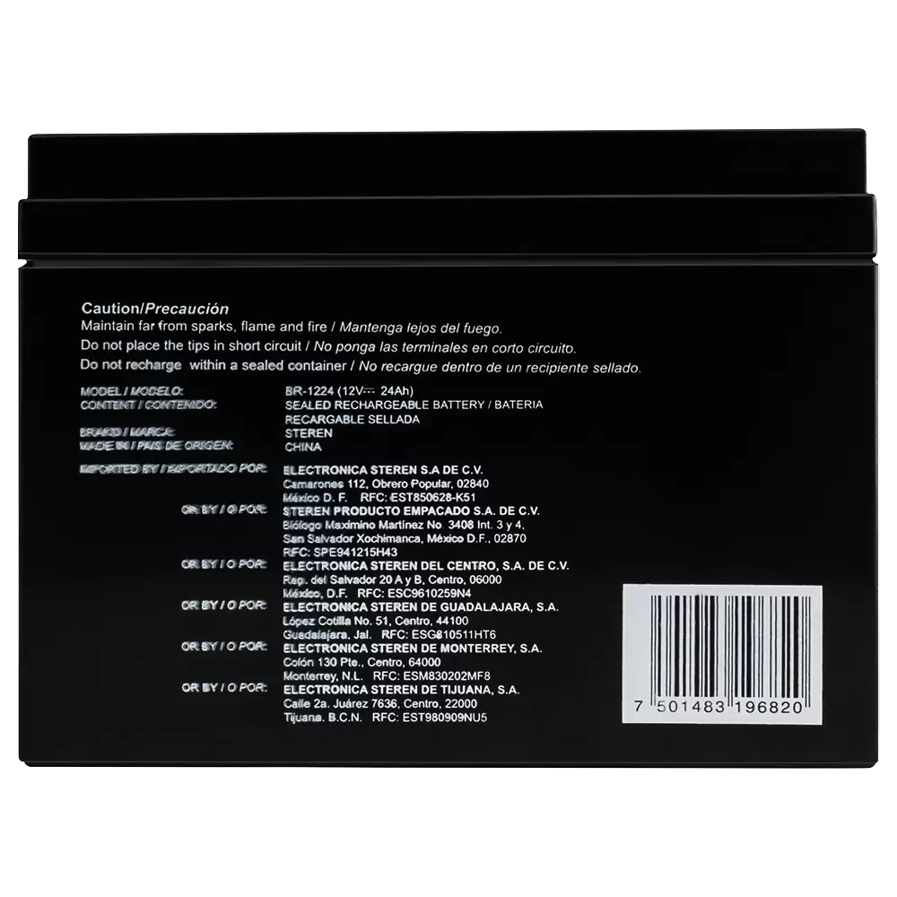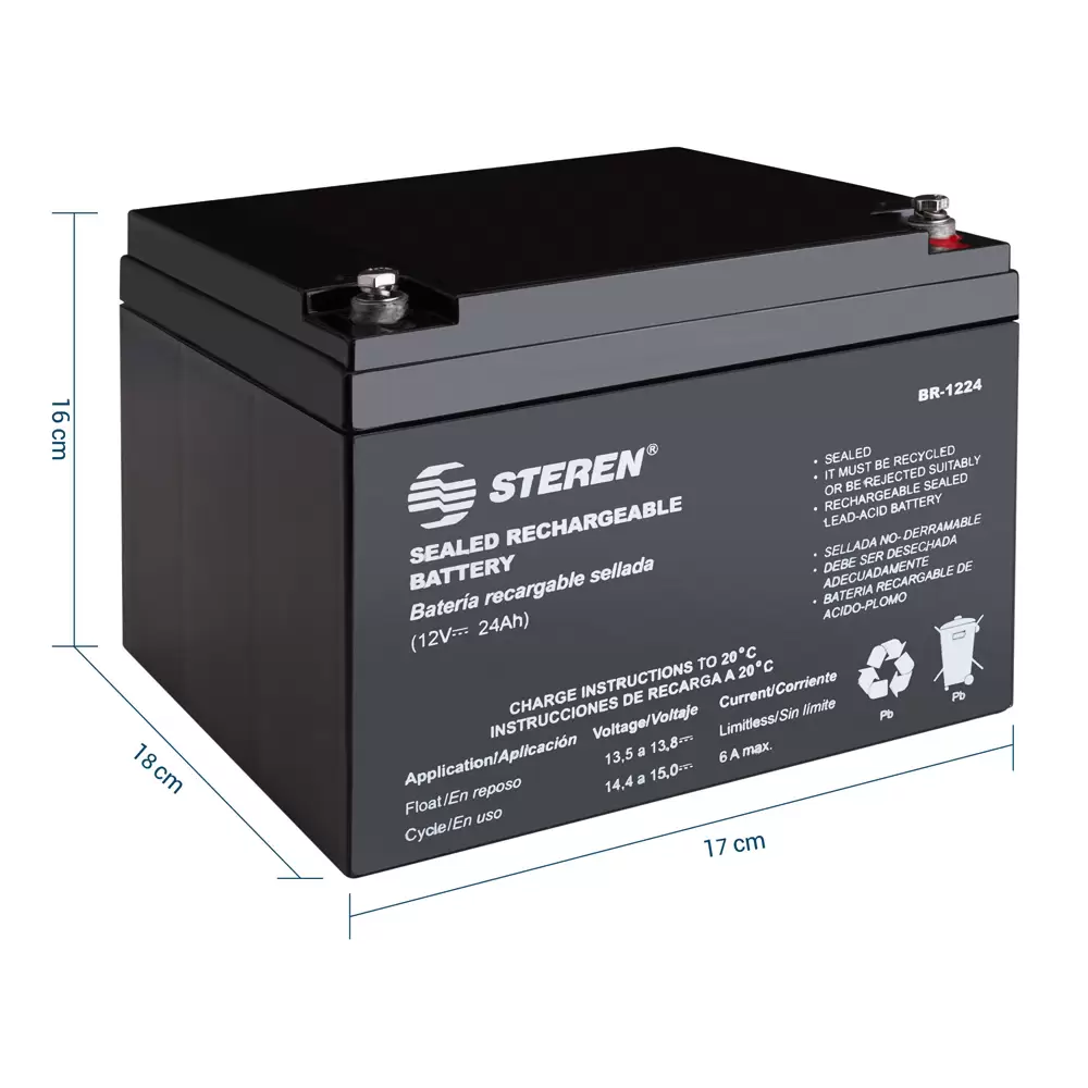 Batería recargable sellada, de ácido-plomo, de 12 Vcc, 24 Amperes/hora y hasta 1000 ciclos de carga/descarga.
