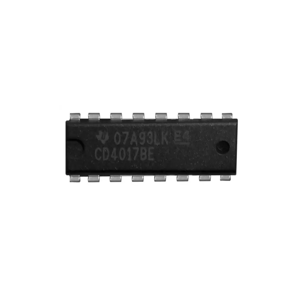 El CD4017 cuenta con 16 pines en total de los cuales, la alimentación del circuito integrado se hace por medio del pin 16 y debido a su tecnología CMOS, puede ser alimentado desde 3 a unos 15 voltios de corriente continua. Sus salidas (que son 10 y se cuenta desde 0 a 9) comienzan desde el pin 3 (Q0) y no se encuentran de forma secuencial, terminando en el pin 11 (Q9).
