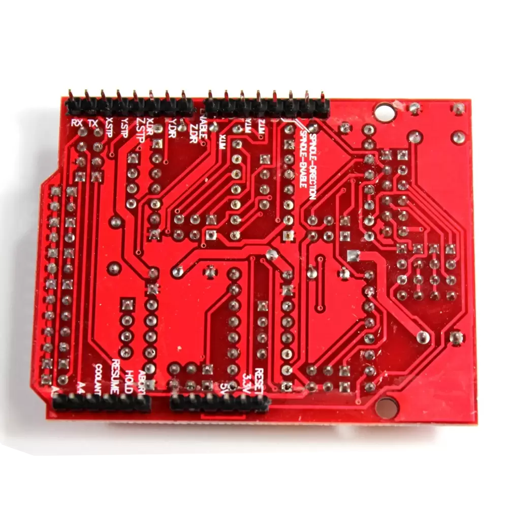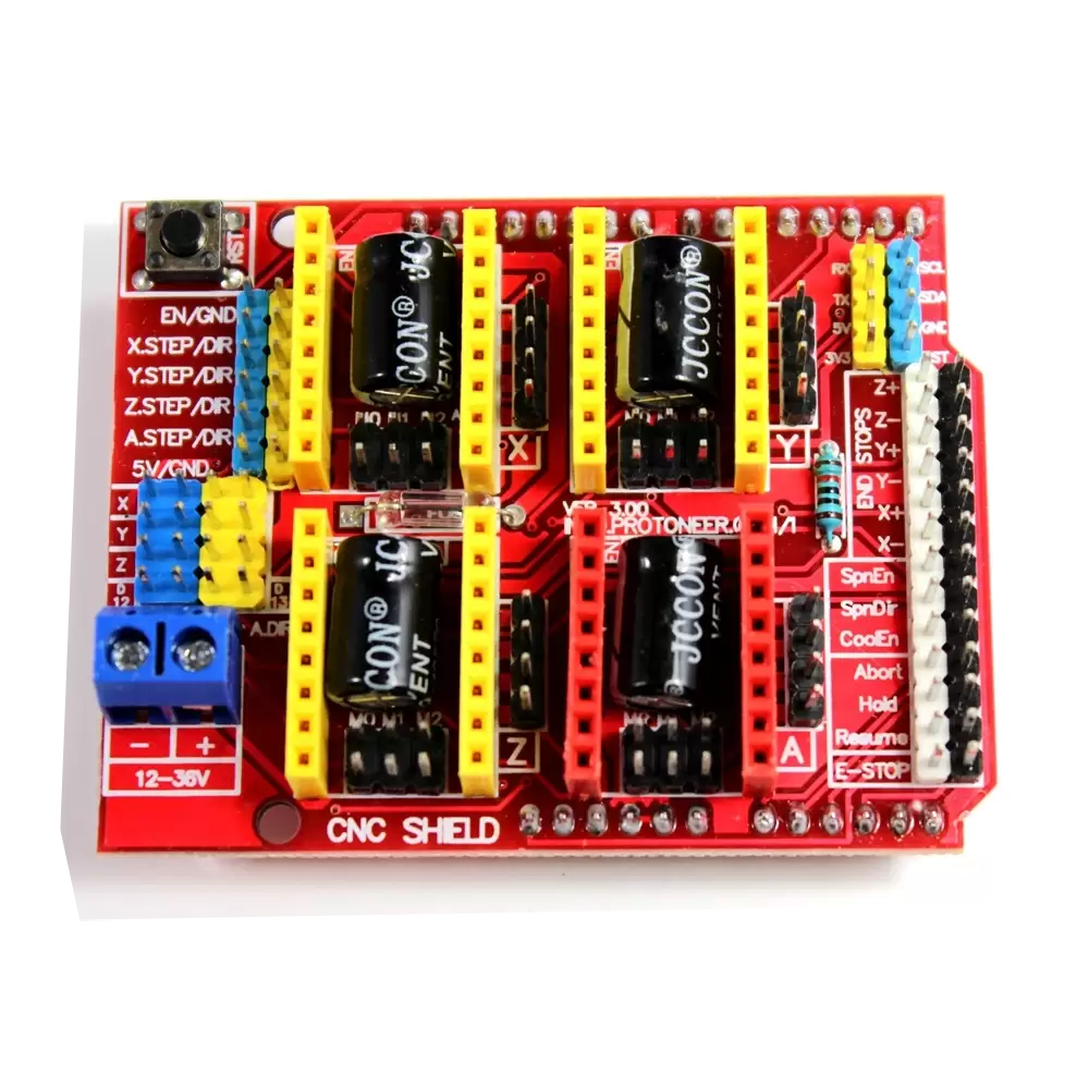 El Cnc Shield V3 es un modulo de expansión que se usa principalmente en máquinas de grabado e impresoras 3D que te permite empezar a construir una maquina CNC, esto en conjunto de la tarjeta de desarrollo Arduino , drivers y fuente de alimentación (no incluidos). Con ayuda del firmware GRBL para Arduino convierte código G a comandos para motor a pasos. Permite manejar 3 motores a pasos de forma independiente (X,Y,Z) y 1 motor adicional (A), por medio de 2 puertos IO. Es compatible con los drivers para motores paso a paso A4988 y/o DRV8825.