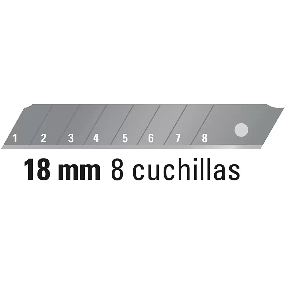 Repuestos para navajas de 18 mm, útil para cortar cartón, piel, plásticos, y para usarse en la casa, oficina o taller. Incluye un práctico y seguro estuche porta navajas.