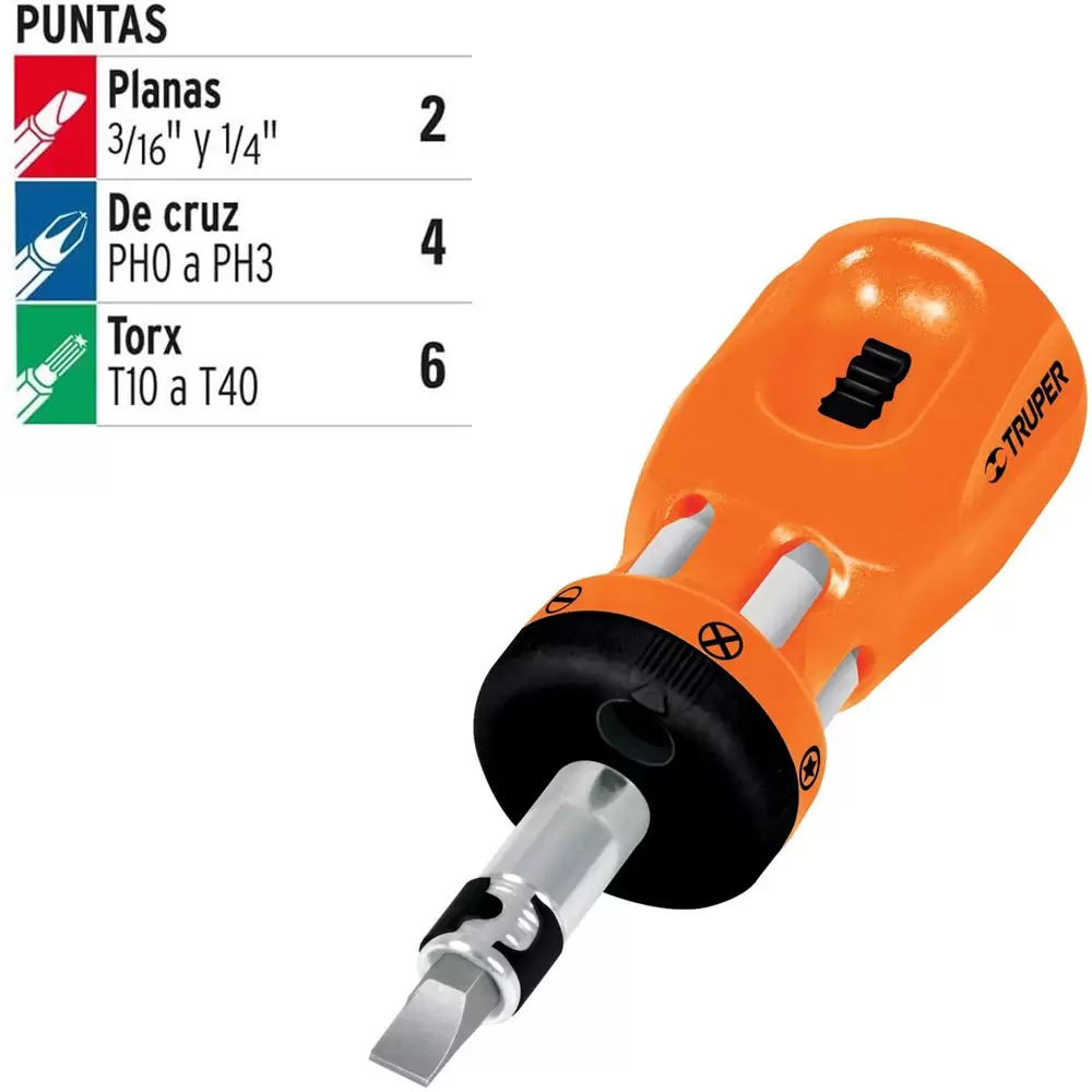 Desarmador tipo trompo matraca que cuenta con un compartimento giratorio y un mango fabricado en plástico ABS, que lo hace muy resistente al impacto, para almacenar las puntas evitando que se pierdan. Su diseño cuenta con entrada hexagonal y permite seleccionar la dirección del desarmador.