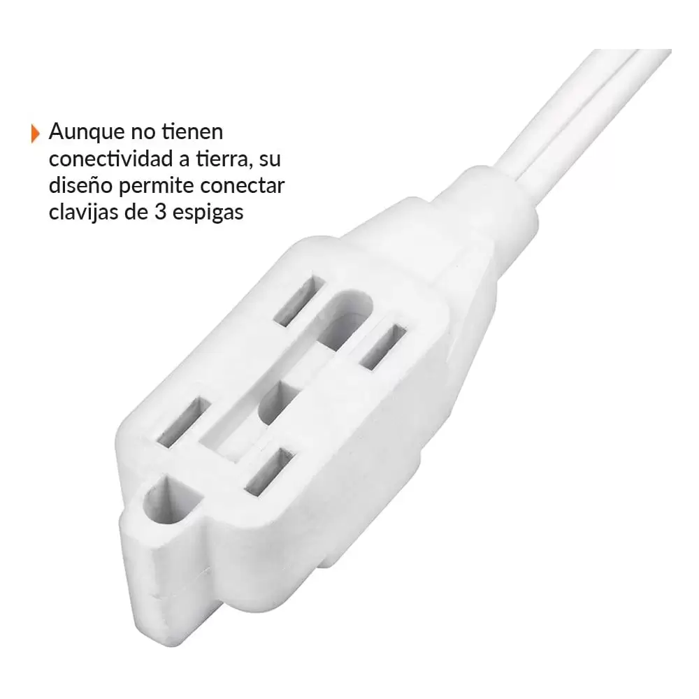 Ideal para conectar televisores, videojuegos, equipos de audio y vídeo, línea blanca y equipos de cómputo. Clavija plana de 90°, ideal para espacios reducidos, aunque no tienen conectividad a tierra, su diseño permite conectar hasta 3 clavijas aterrizadas.