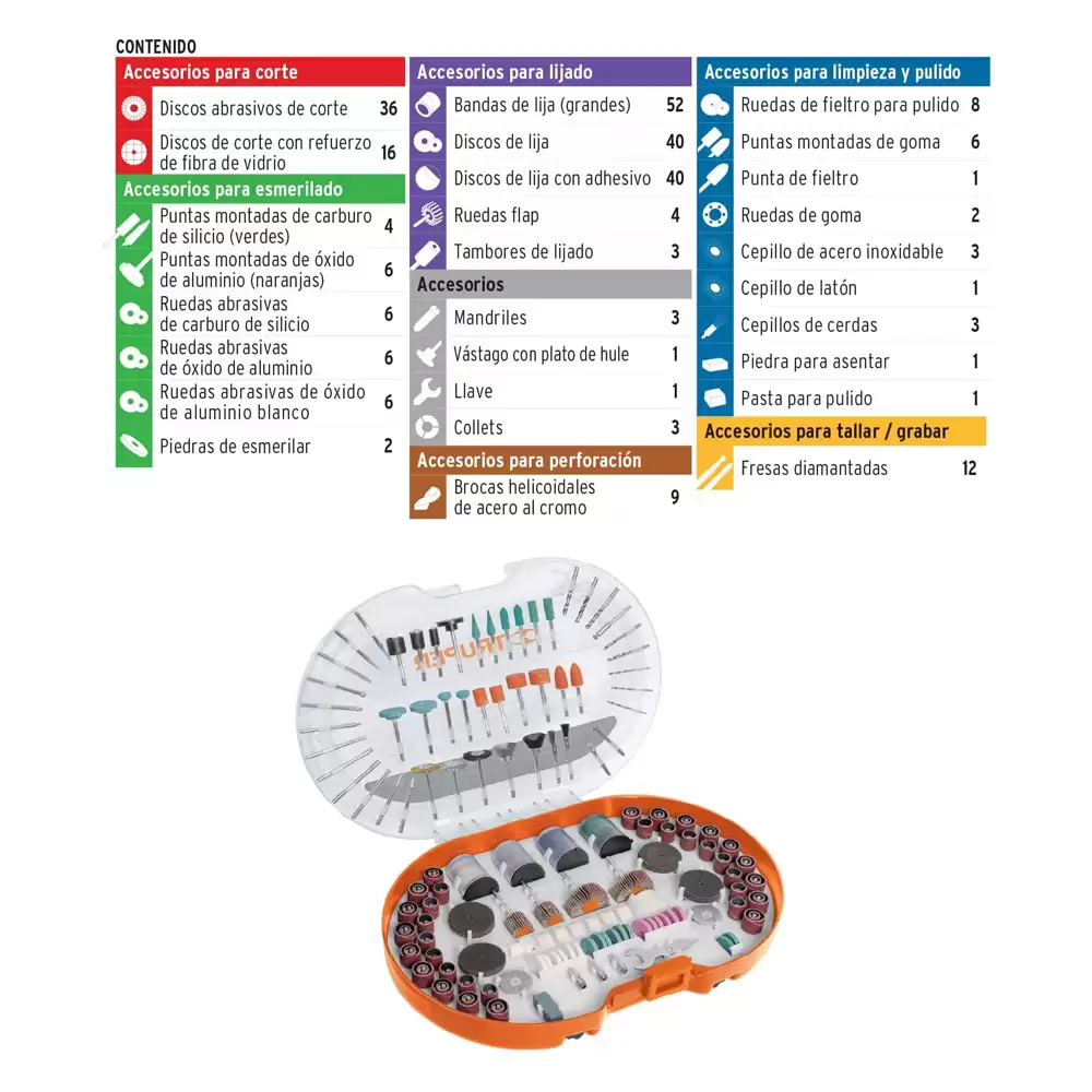 Con Collet de 1/8" compatible con las principales marcas del mercado, cambio fácil de escobillas gracias a su acceso externo, botón de bloqueo para cambio rápido y seguro de accesorios, incluye gancho integrado que permite colgar herramienta y utilizar su extensión flexible tipo lápiz, portátil estuche plástico para garantizar una fácil transportación y un correcto almacenamiento.