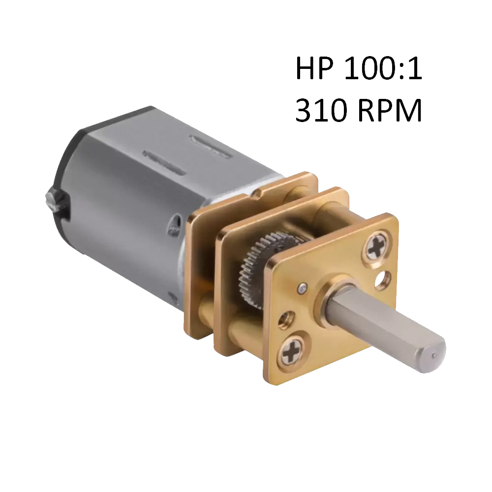 Este es un micromotorreductor con una relacion de 100:1 a una velocidad de 310 RPM y un torque de 1.7 Kg.cm, que a pesar de su pequeño tamaño tiene grandes ventajas, la principal es que los micromotorreductores se pueden encontrar con diferentes configuraciones y tienen la misma forma y tamaño, esto es muy útil cuando se requiere cambiar el tipo de motor ya sea por que se quiere tener una mayor o menor velocidad y/o un mayor o menor torque. Los pueden utilizar por lo general en proyectos de competencia como los robots mini-sumo o los seguidores de lineas, o también para funciones de alguna maquina como dispensadores de papel, cerraduras eléctricas, etc..