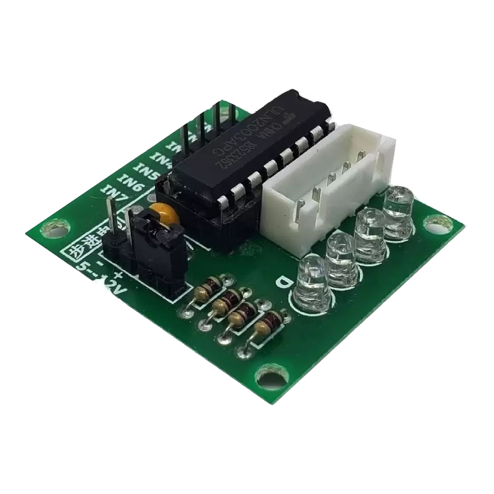 El PCB controlador de motor paso a paso ULN2003 proporciona una interfaz de accionamiento directo entre su microcontrolador y motor paso a paso. El PCB proporciona 4 entradas para la conexión a su microcontrolador, fuente de alimentación conexión para el voltaje del motor paso a paso, y puente ON / OFF, un conector de motor paso a paso de conexión directa y 4 LED para indicar el estado de avance.
