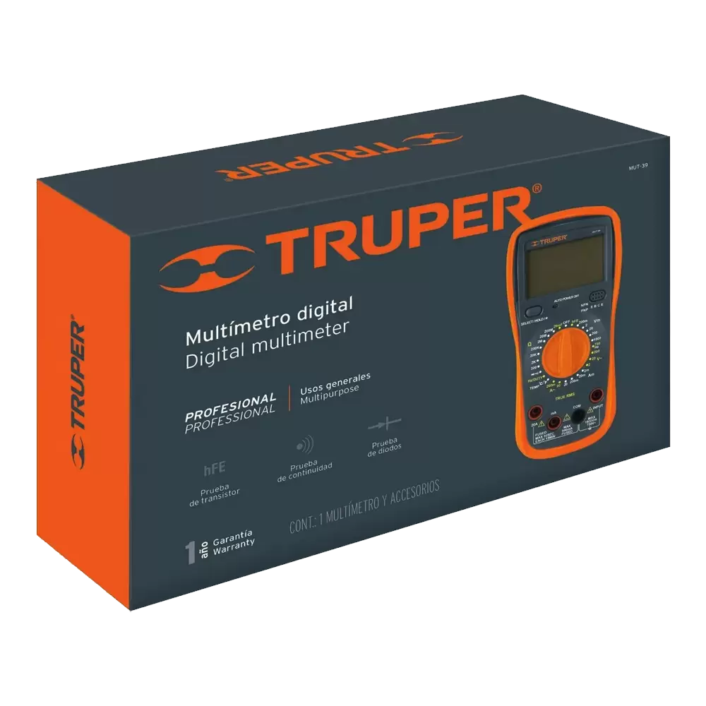 Multímetro digital profesional, marca TRUPER. Usos para mantenimiento industrial.Una de sus funciones son prueba de transistor. Ideal para realizar trabajos de medición de corriente, resistencia,continuidad, entre muchas más.Cuenta con cubierta protectora contra impactos. De gran duración y de alta calidad.