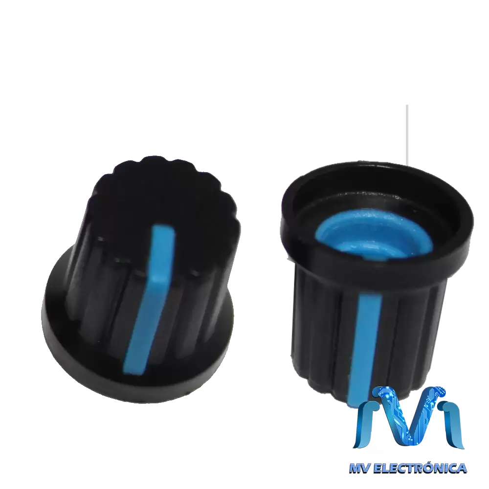 Perillas para potenciómetro económica de plástico color azul. El potenciómetro es giratorio. Con esta perilla de línea azul podrás operar de manera más sencilla y segura cualquier Potenciómetro, (dependiendo de las especificaciones abajo mencionadas) y facilitarte así, la operación del manejo de cualquier aparato de medición, música (mezcladoras, amplificadores, etc.), tus proyectos electrónicos y más en donde sean requeridas. Además, podrás ofrecer una excelente presentación y color a tus proyectos de electrónica.