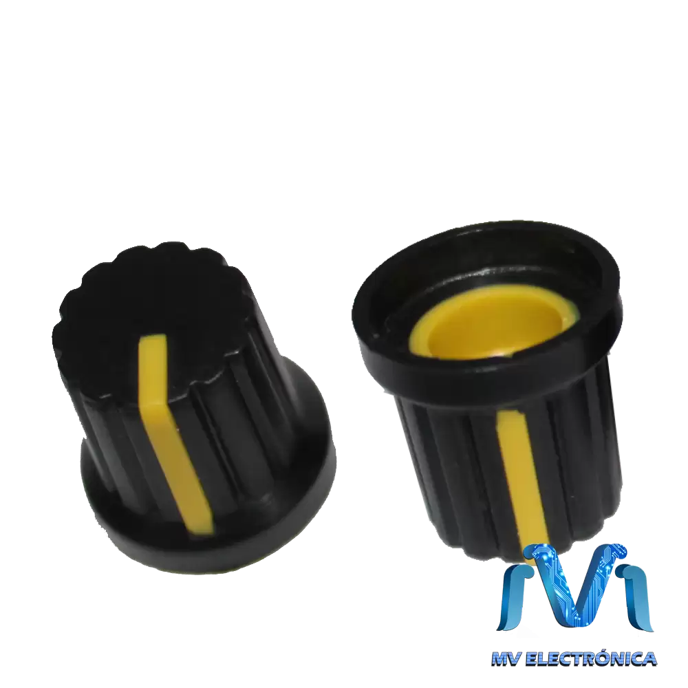 Esta perilla en color negro son ideales para los potenciómetros, son vistosas, fácil manejo, son más cómodas para manejar el potenciómetro, son ideales para ecualizadores, en proyectos escolares y en manejo de equipos electrónicos variados. Fácil de usar y de colocar, no resbala y tiene un indicador de color amarillo;