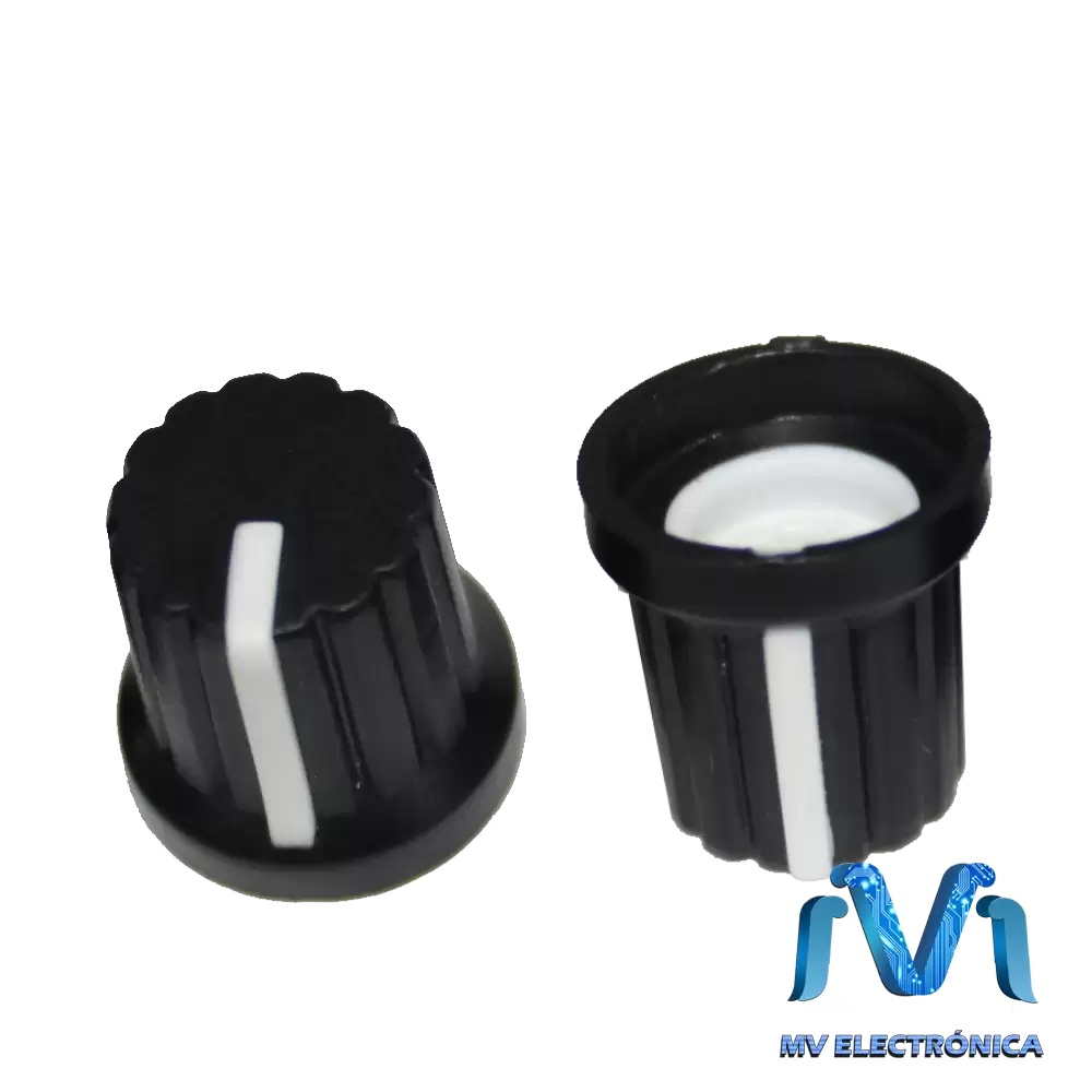 Perillas para potenciómetro económica de plástico color blanco. El potenciómetro es giratorio. Con esta perilla de línea blanca podrás operar de manera más sencilla y segura cualquier Potenciómetro, (dependiendo de las especificaciones abajo mencionadas) y facilitarte así, la operación del manejo de cualquier aparato de medición, música (mezcladoras, amplificadores, etc.), tus proyectos electrónicos y más en donde sean requeridas. Además, podrás ofrecer una excelente presentación y color a tus proyectos de electrónica.