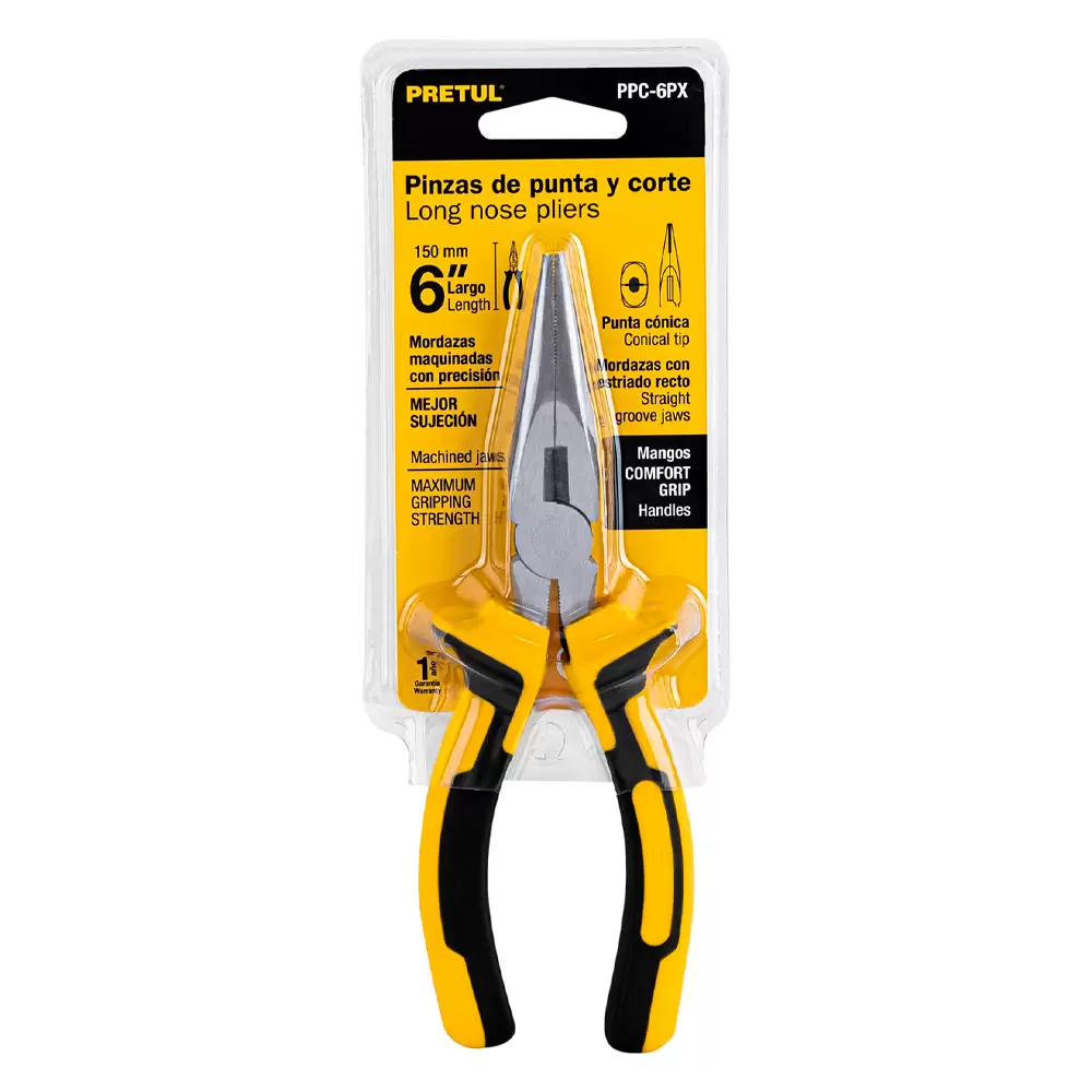 - Punta plana y mordaza con estriado diagonal para agarre firme y seguro.