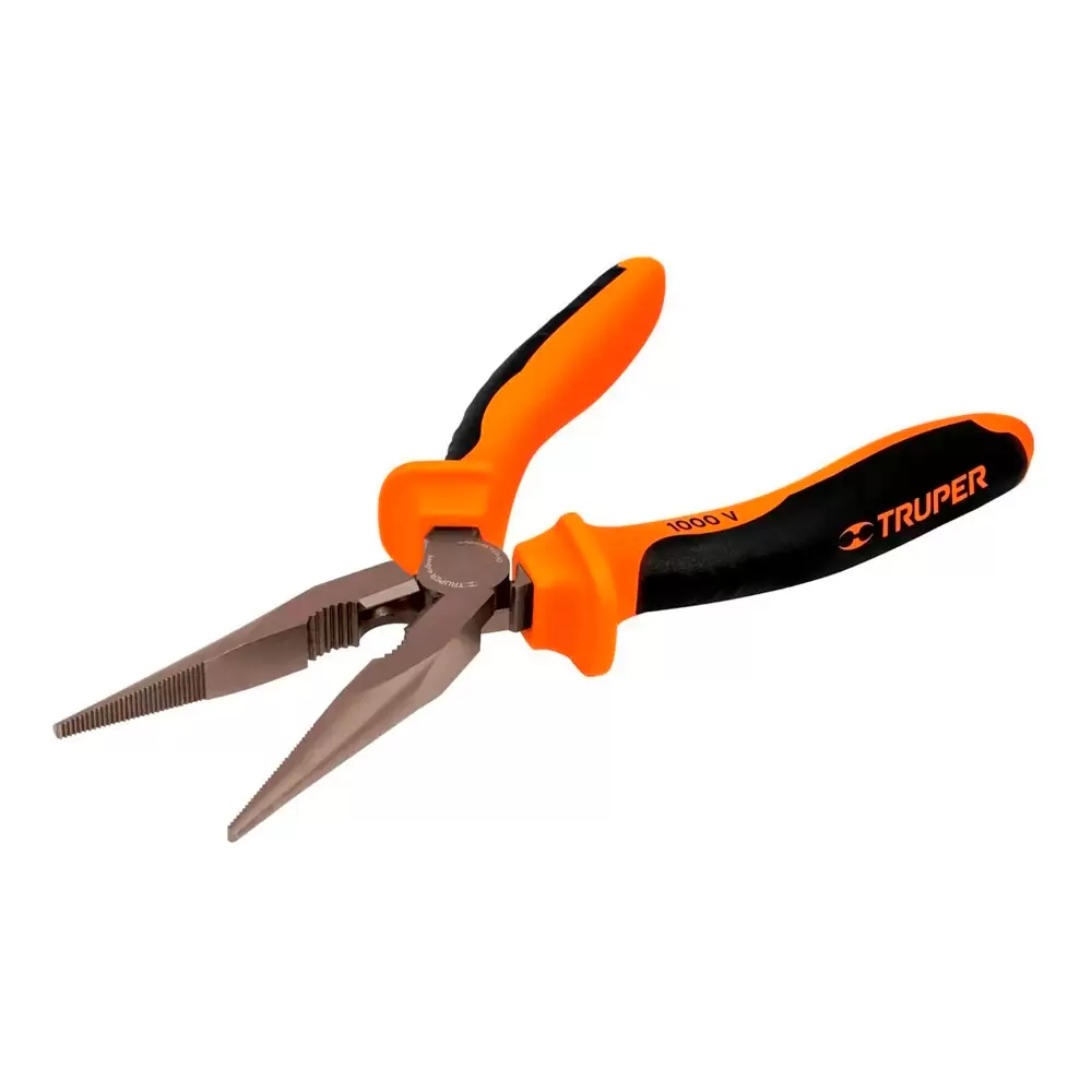 - Punta plana y mordaza con estriado diagonal para agarre firme y seguro.