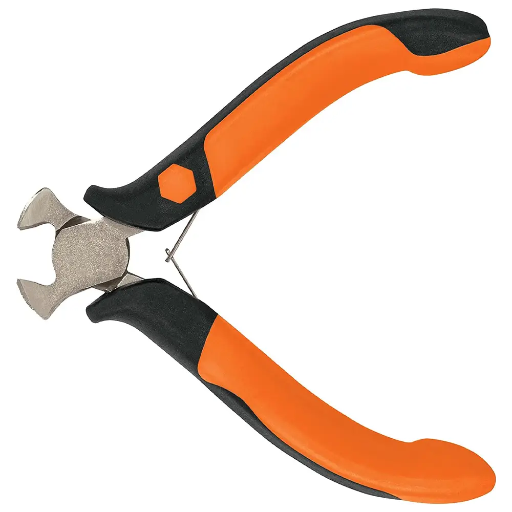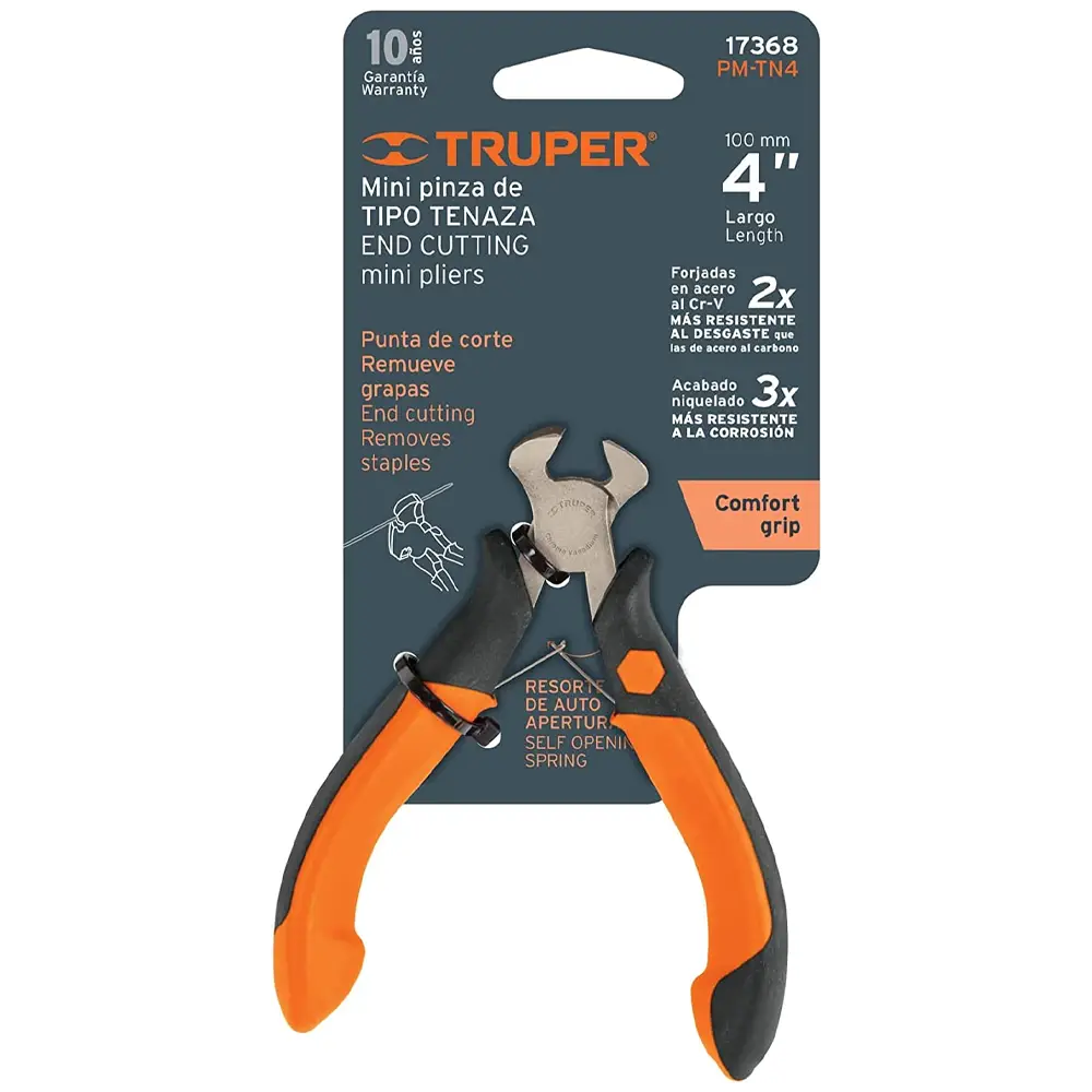 Con diseño miniatura, para un mejor comfort. Fabricada en acero al cromo vanadio 2 veces más resistentes al desgaste que las de acero al carbono. Acabado niquelado, 3 veces más resistente a la corrosión. Mango comfort grip fabricado en plástico TPR con doble inyección en color naranja y negro. Con topes en los mangos que proporcionan mayor comodidad. Puntas tipo tenaza. Con resorte entre los mangos para facilitar la apertura de la pinza.
