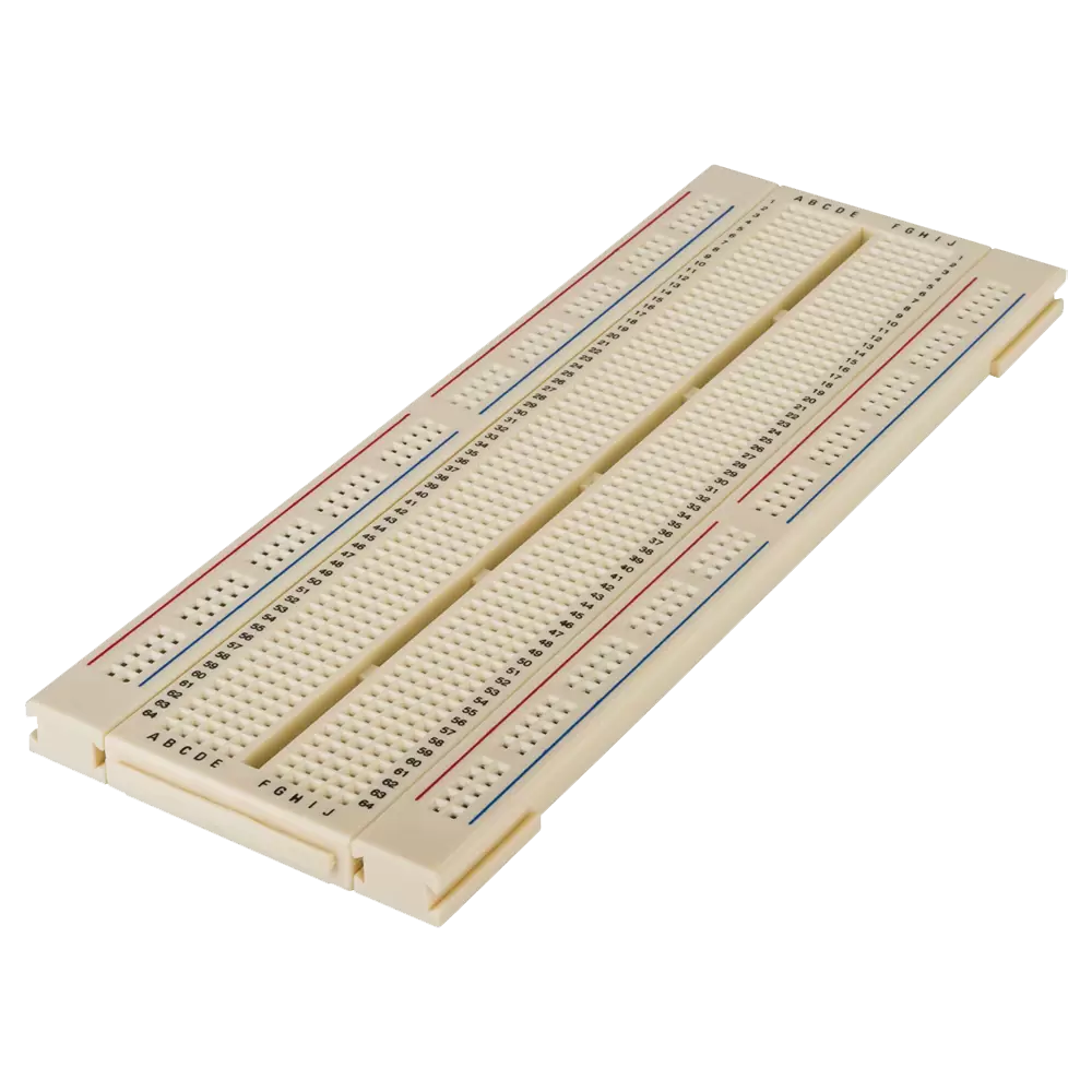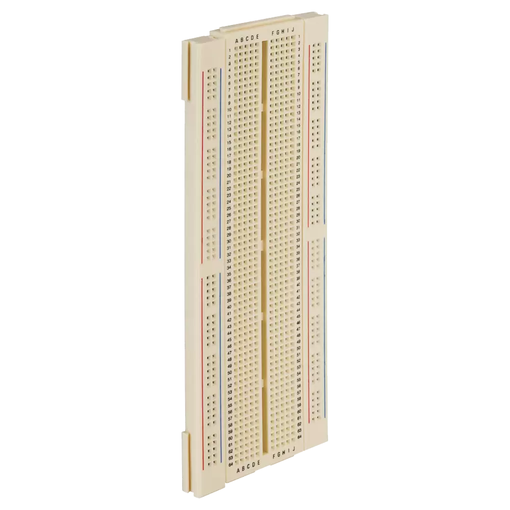 Tablilla de conexión (Protoboard), con 1 bloque, 2 tiras, sin bornes y 840 perforaciones. Mide 6,4 x 17,2 cm; útil para armar prototipos de circuitos electrónicos.