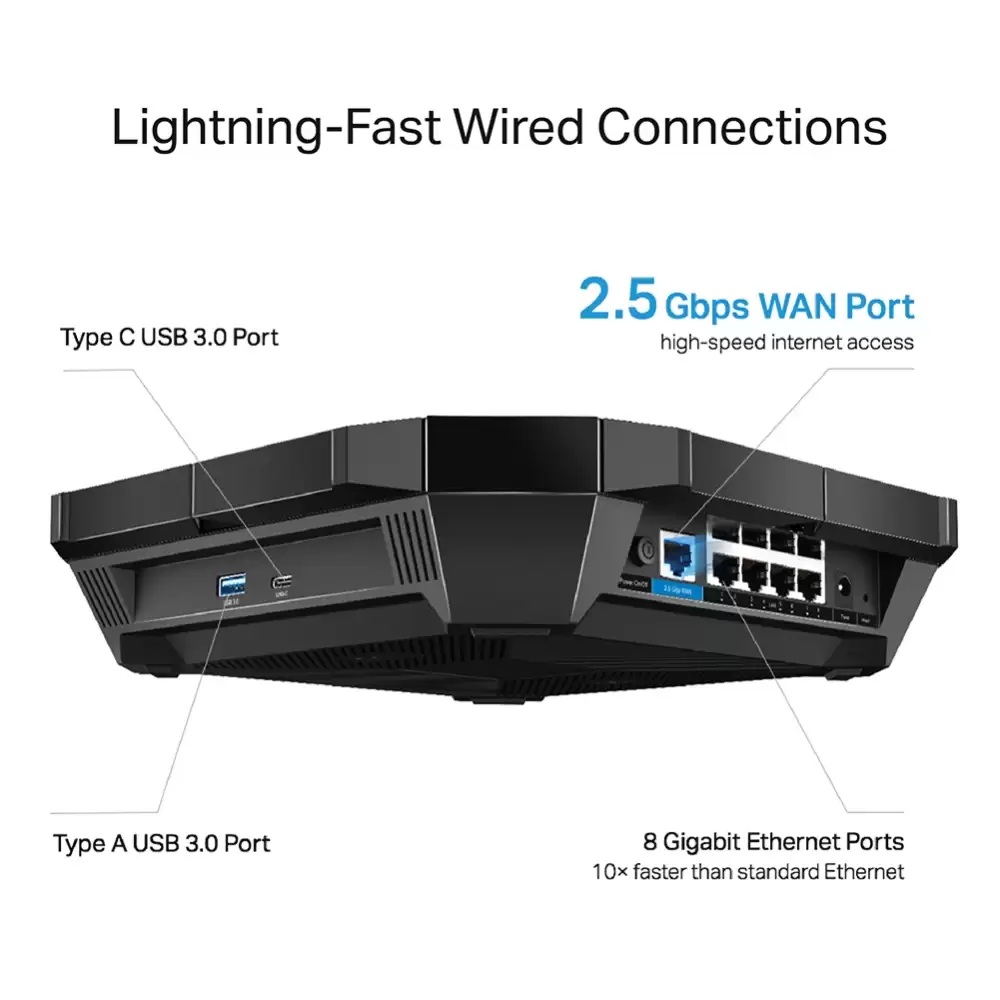 - Ultra Conectividad - 1 × Puerto 2.5 Gbps WAN, 8 × Puertos Gigabit LAN, y 2 × USB 3.0 Tipo y Tipo C.