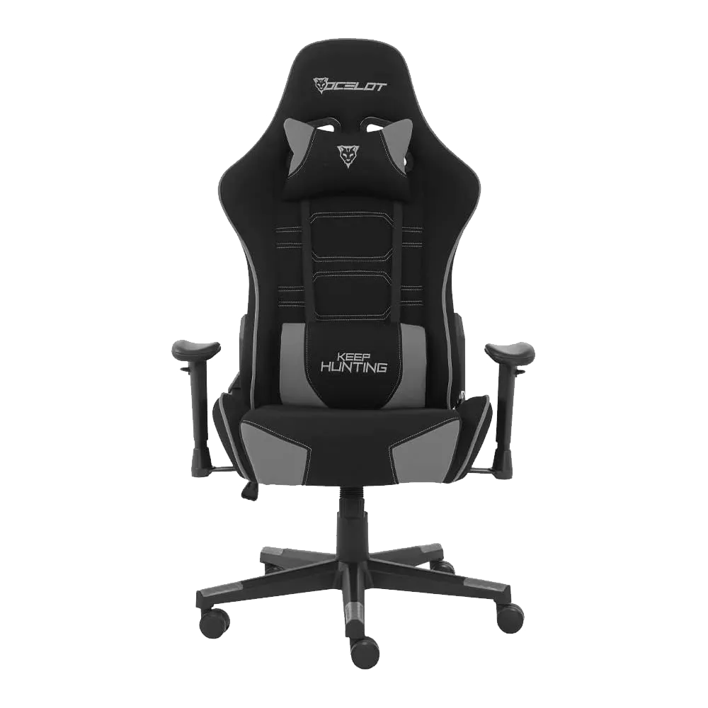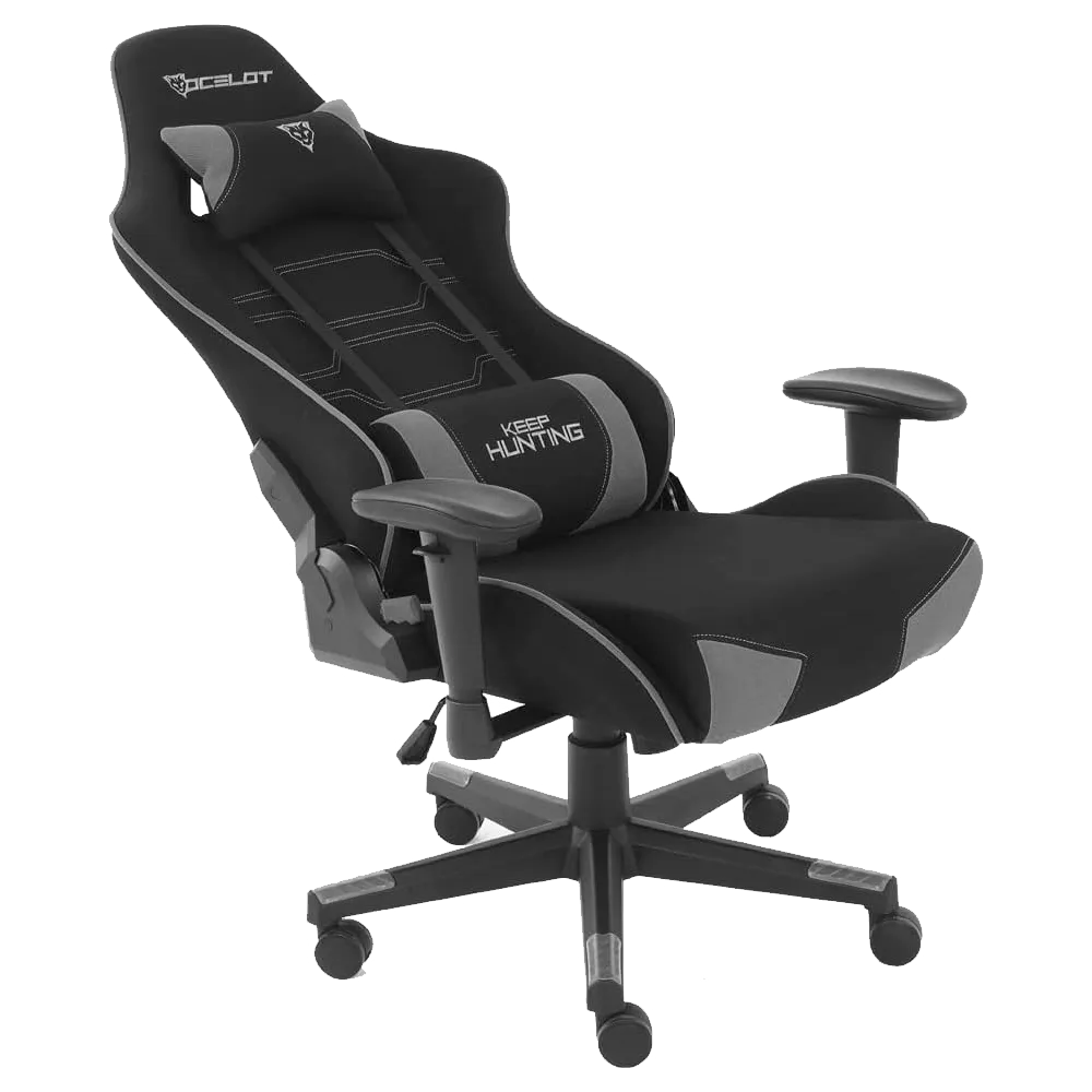 Silla Gamer De Tela Ocelot Negro Y Gris Con Base Reforzada De Nylon Descansa Brazos Ajustables Y Angulo De Inclinacion 155 Grados, Soporta Hasta 150kg, Cojin Para Lumbar Y Cervical