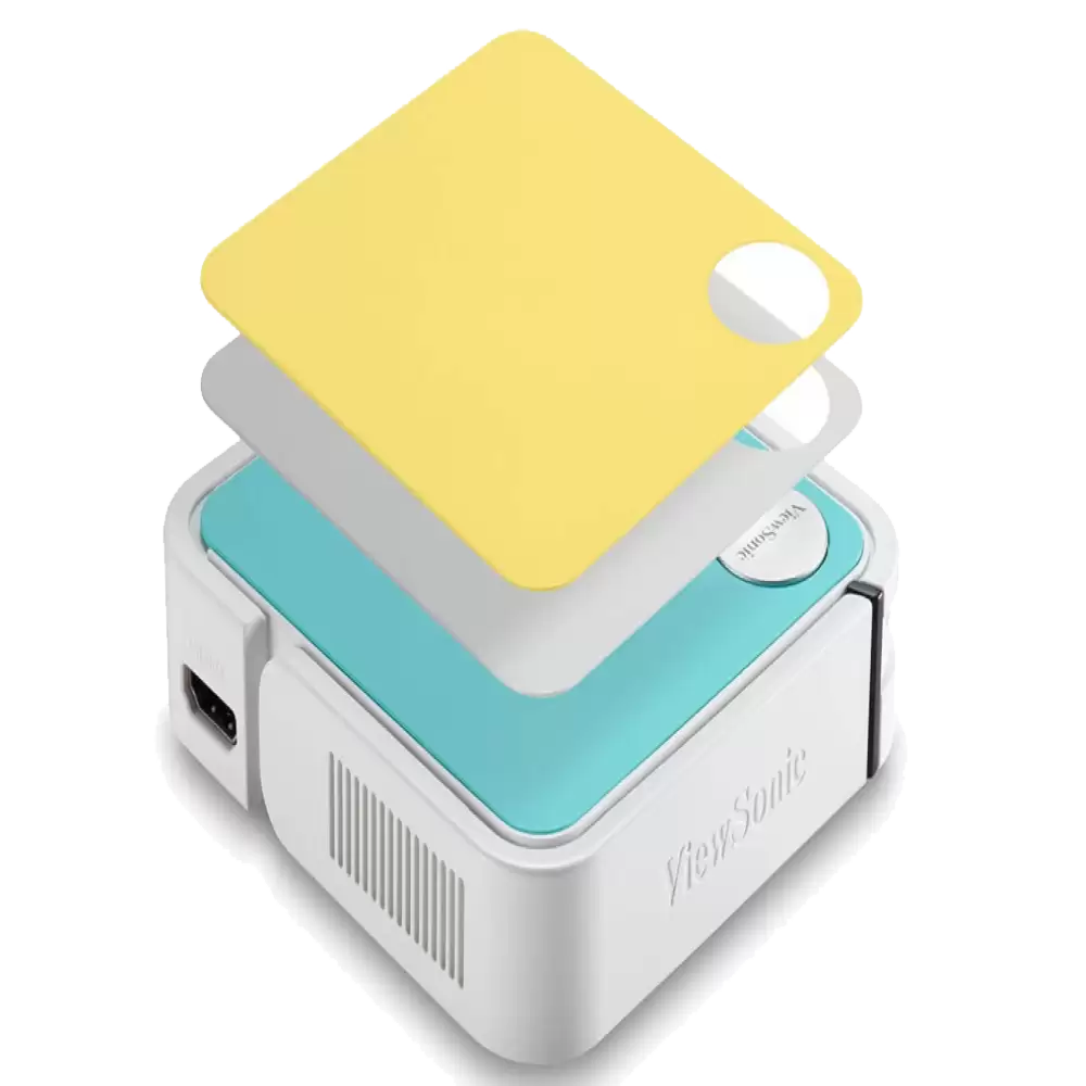 Este diminuto proyector puede colocarse en un bolso mochila o bolsillo trasero lo que lo hace perfecto para el entretenimiento durante un viaje. También incluye paneles intercambiables en tres colores diferentes gris amarillo y verde azulado para que pueda cambiar el aspecto del proyector y adaptarlo a su estilo la base inteligente integrada.